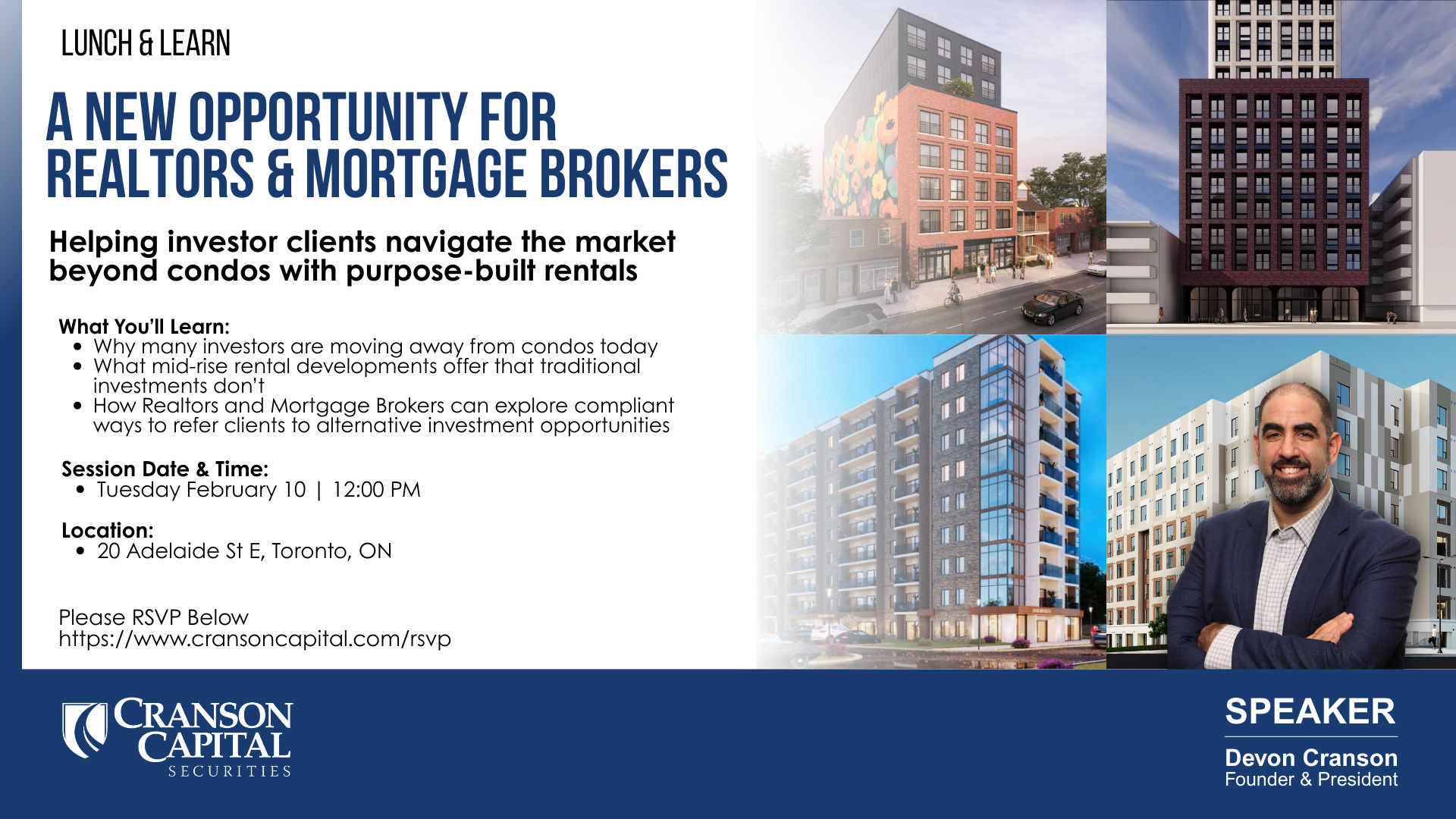 Join us for sandwiches and refreshments at a Lunch & Learn as we explore smarter ways to help investor clients deploy capital when condos aren’t working — and how you can earn referral fees in the process.